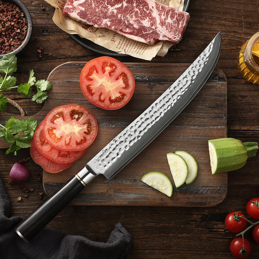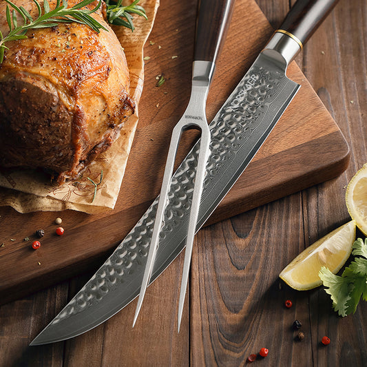Forskærerkniv – Ideel til udskæring af store stykker kød som stege, skinker og kalkun. Den lange, slanke klinge sikrer rene og præcise snit, hvilket bevarer saftigheden i kødet.