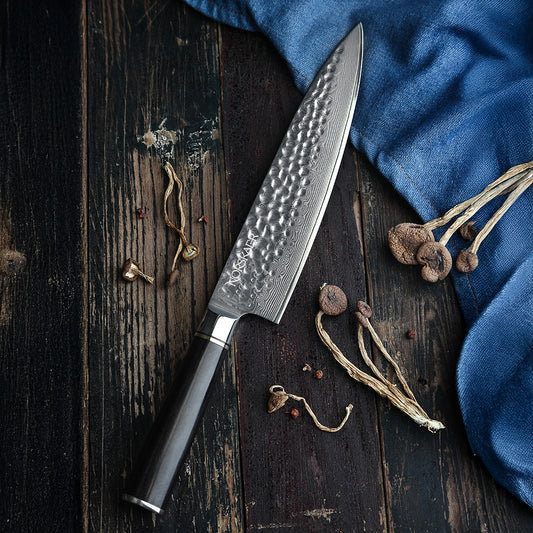 Norskaer Original er fremstillet med 67-lags hamret damaskusstål, hvilket ikke kun giver knivene deres karakteristiske bølgede mønster, men også øger deres skæreevne og holdbarhed. Det hamrede mønster reducerer friktionen, når du skærer, hvilket gør knivene ideelle til præcisionsarbejde. De mange lag stål giver knivene en perfekt balance mellem styrke og fleksibilitet, hvilket sikrer, at de forbliver skarpe, mens de samtidig er modstandsdygtige over for skader og brud.