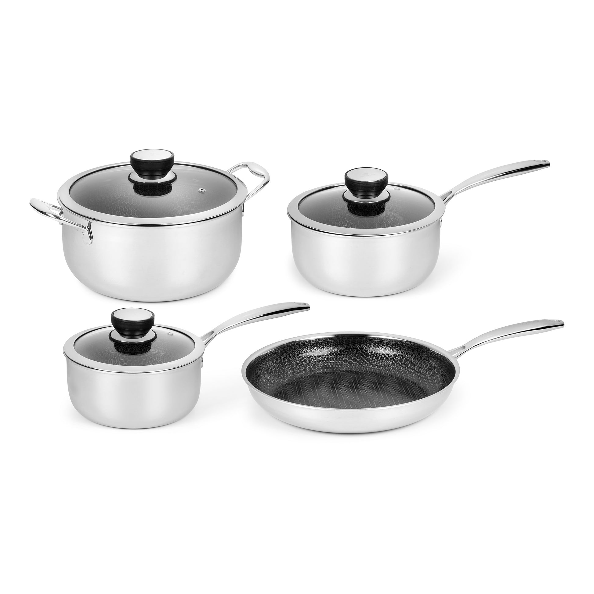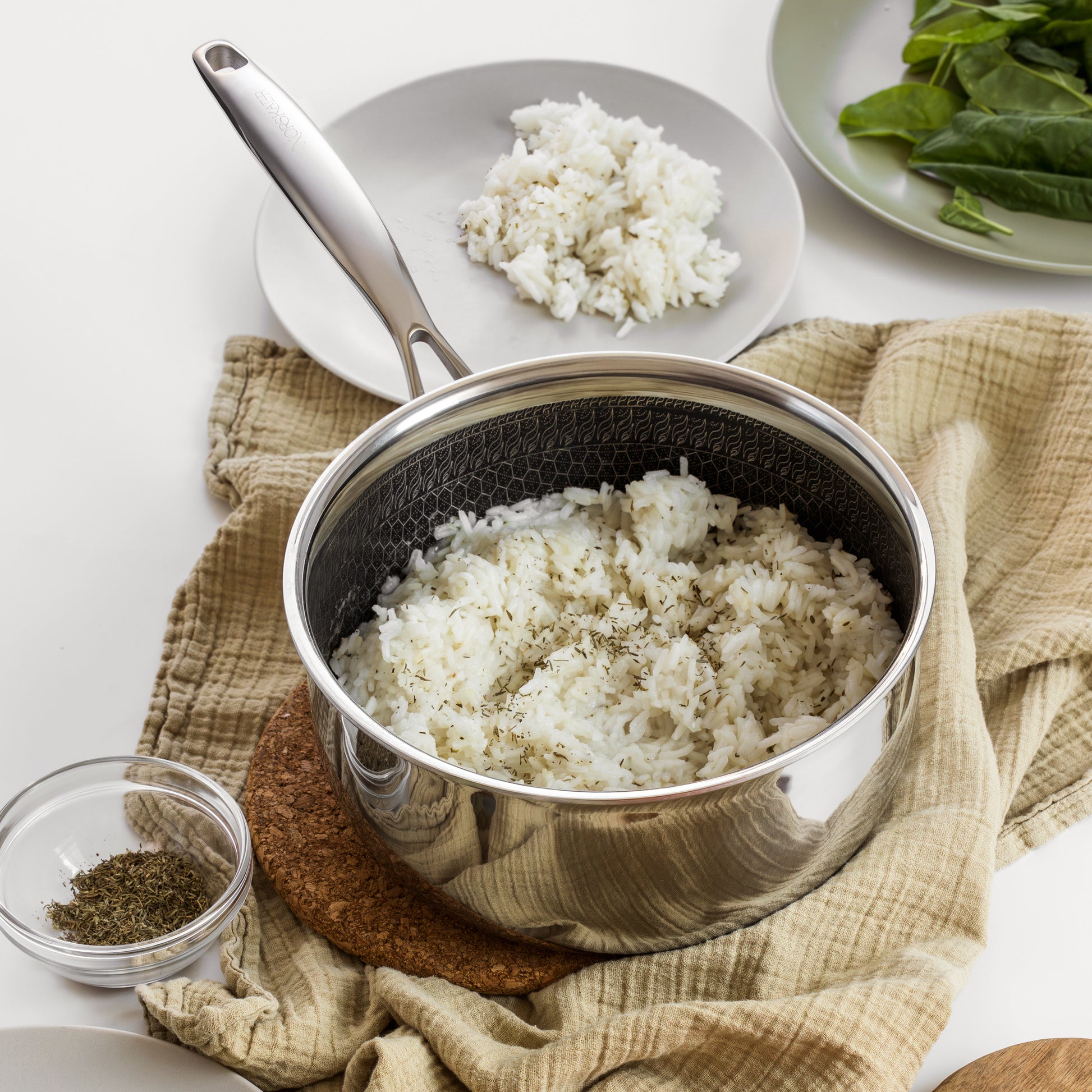 Bag belægningen ligger den solide Tri-Ply rustfrit stålkonstruktion, der giver produkterne deres fremragende varmefordeling og robusthed. Denne konstruktion består af tre nøje sammensatte lag: et ydre lag af rustfrit stål, der beskytter mod korrosion og sikrer en flot og langtidsholdbar finish; en kerne af aluminium, som er kendt for sin fremragende varmeledningsevne, der sikrer en jævn opvarmning uden kolde pletter; og et indre lag af rustfrit stål, der gør gryder og pander kompatible med alle varmekilder, inklusive induktion. Denne konstruktion gør produkterne ideelle til præcis temperaturkontrol, hvilket giver perfekte resultater, uanset om du simrer, steger eller koger.