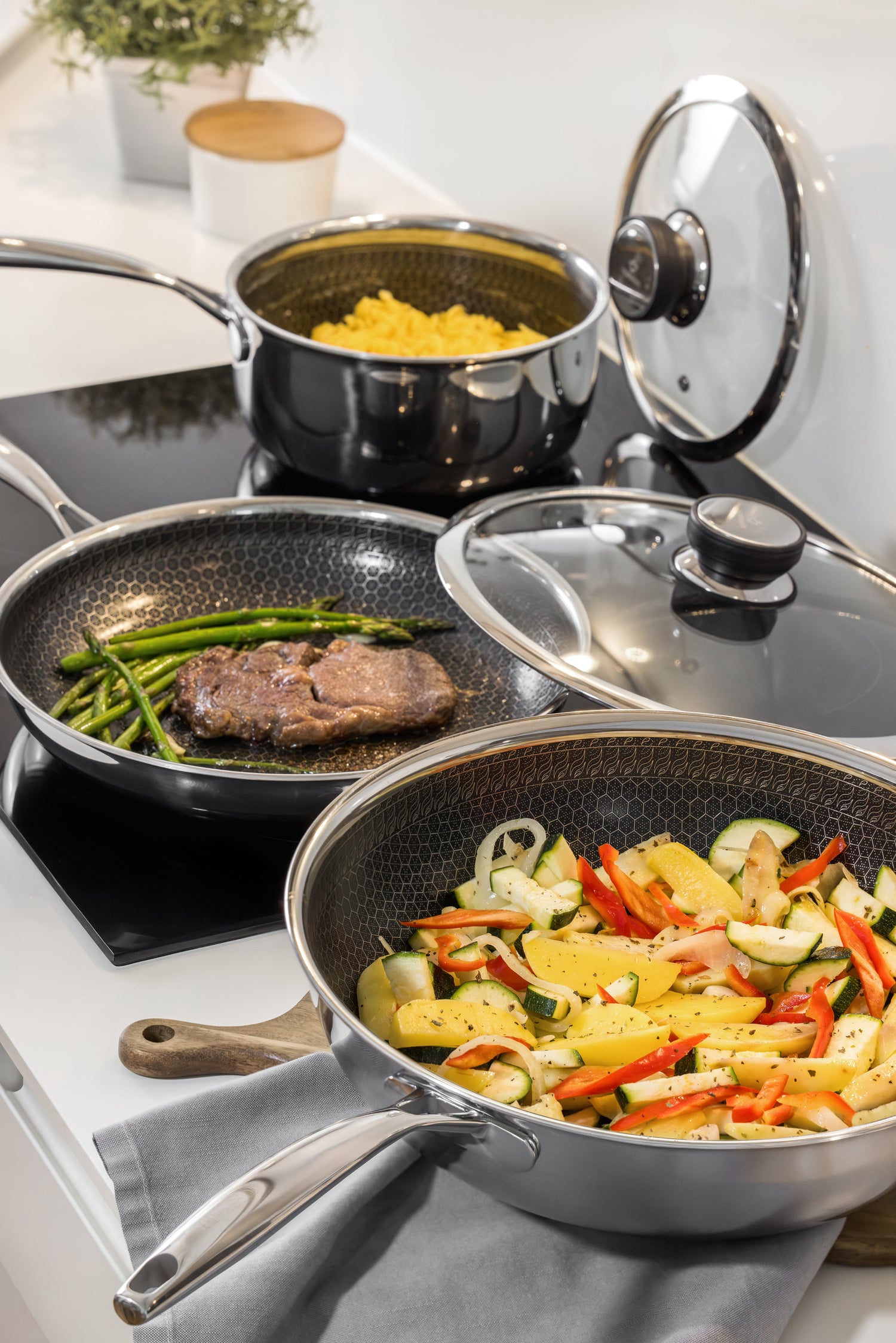 Bag belægningen ligger den solide Tri-Ply rustfrit stålkonstruktion, der giver produkterne deres fremragende varmefordeling og robusthed. Denne konstruktion består af tre nøje sammensatte lag: et ydre lag af rustfrit stål, der beskytter mod korrosion og sikrer en flot og langtidsholdbar finish; en kerne af aluminium, som er kendt for sin fremragende varmeledningsevne, der sikrer en jævn opvarmning uden kolde pletter; og et indre lag af rustfrit stål, der gør gryder og pander kompatible med alle varmekilder, inklusive induktion. Denne konstruktion gør produkterne ideelle til præcis temperaturkontrol, hvilket giver perfekte resultater, uanset om du simrer, steger eller koger.