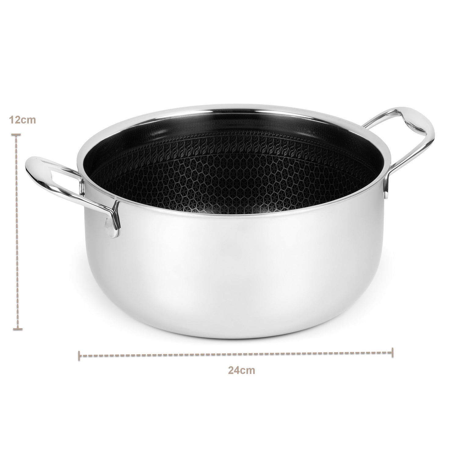 Bag belægningen ligger den solide Tri-Ply rustfrit stålkonstruktion, der giver produkterne deres fremragende varmefordeling og robusthed. Denne konstruktion består af tre nøje sammensatte lag: et ydre lag af rustfrit stål, der beskytter mod korrosion og sikrer en flot og langtidsholdbar finish; en kerne af aluminium, som er kendt for sin fremragende varmeledningsevne, der sikrer en jævn opvarmning uden kolde pletter; og et indre lag af rustfrit stål, der gør gryder og pander kompatible med alle varmekilder, inklusive induktion. Denne konstruktion gør produkterne ideelle til præcis temperaturkontrol, hvilket giver perfekte resultater, uanset om du simrer, steger eller koger.