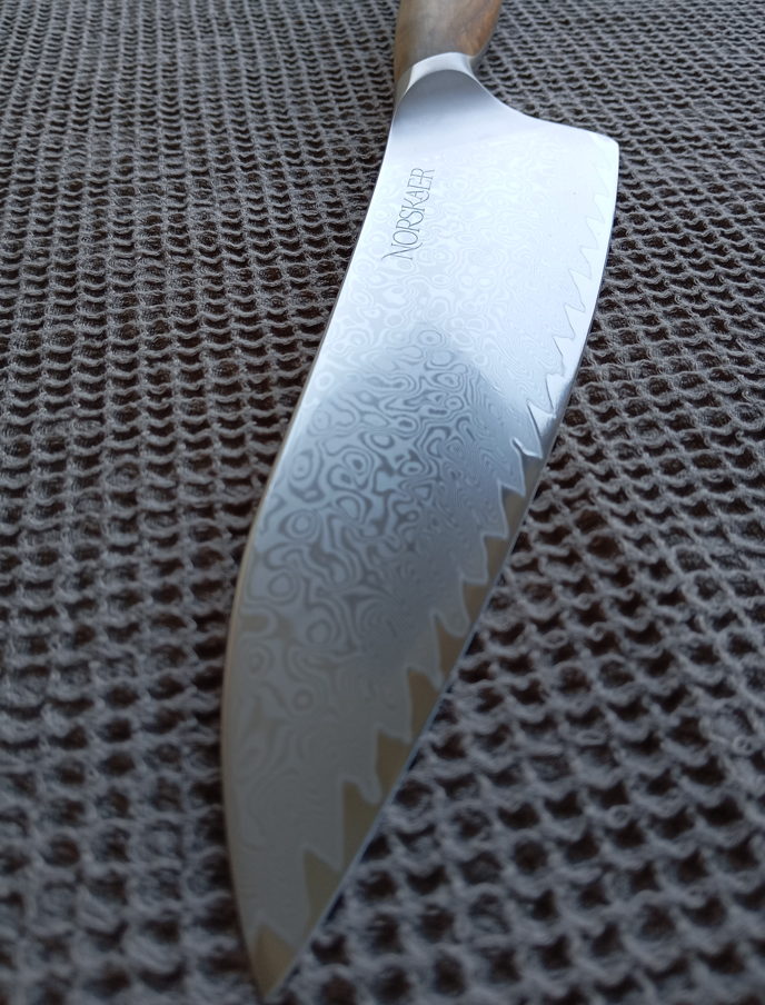 Vores damaskusstål, som anvendes til fremstillingen af vores Norskaer Olive Wood Knive, opnår en imponerende hårdhed på 64 HRC. Denne hårdhedsgrad er nøje udvalgt for at sikre, at vores knive opretholder deres skarphed og ydeevne over længere tid, samtidig med at de bevarer deres holdbarhed og modstandskraft mod slitage. Ved at kombinere den avancerede konstruktion af damaskusstål med en optimal hårdhed, stræber vi efter at tilbyde dig knive af højeste kvalitet, der kan leve op til dine forventninger og behov i køkkenet.
