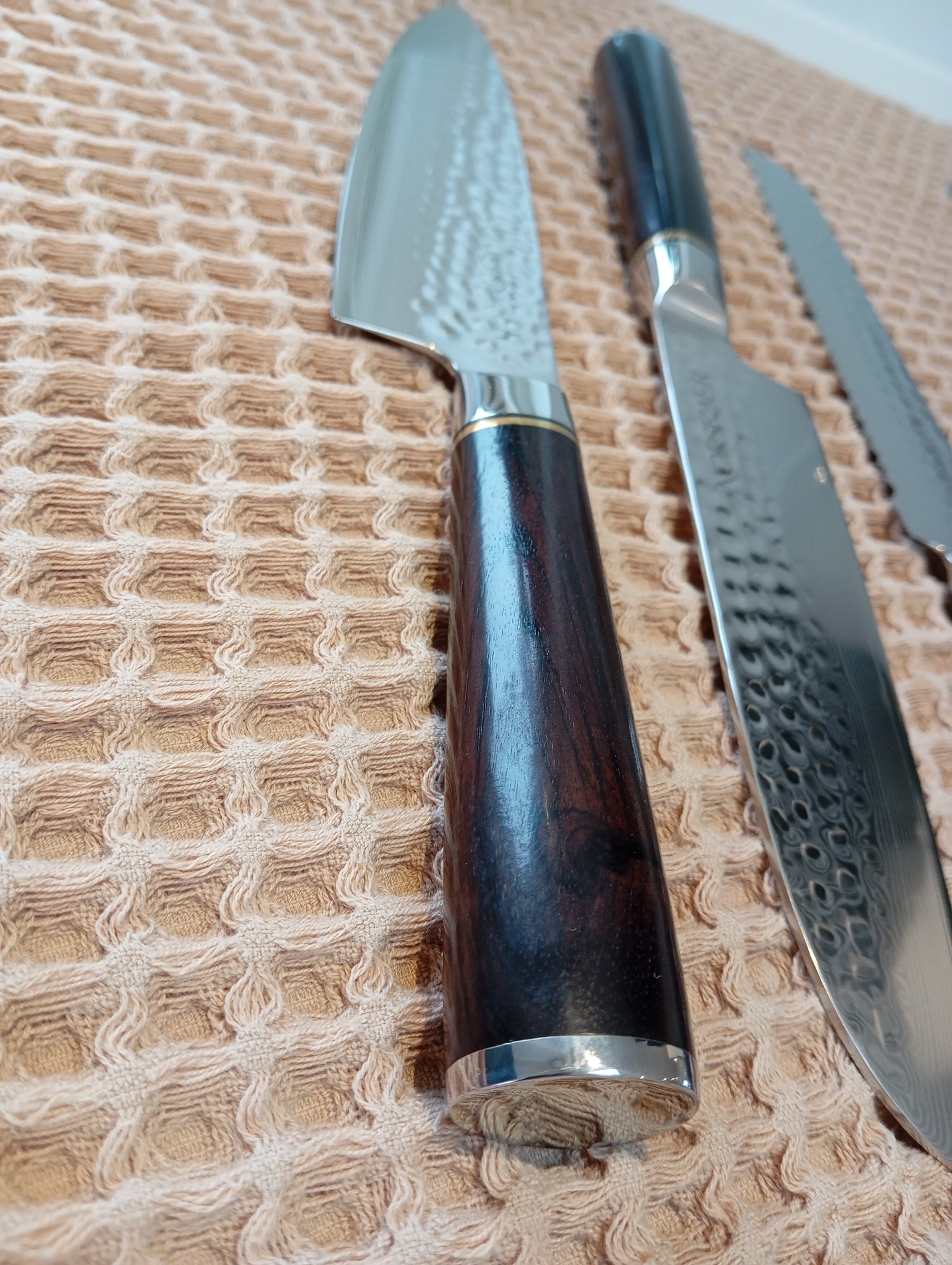 Vores damaskusstål fremstilles ved hjælp af moderne teknologi, der giver os præcis kontrol over varmeprocessen under produktionen. Denne proces involverer flere trin. Først bliver lagene af stål smedet sammen ved høje temperaturer. Denne proces kræver nøje overvågning for at sikre, at lagene binder korrekt og danner en solid, homogen struktur. Derefter foldes stålet gentagne gange under smedningen for at skabe de mange lag. Hver foldning fordobler antallet af lag, hvilket resulterer i det komplekse mønster og de 67 lag. Efter smedningen gennemgår stålet en nøje kontrolleret varmebehandlingsproces. Dette indebærer opvarmning og derefter langsom afkøling af stålet for at hærde det. Varmebehandlingen styrker stålets struktur og forbedrer dets holdbarhed. Når varmebehandlingen er afsluttet, bliver knivene slebet og poleret til en skarp kant. Det karakteristiske damaskusmønster træder frem på overfladen, hvilket ikke kun giver kniven et smukt udseende, men også en ekstra dimension af funktionalitet.